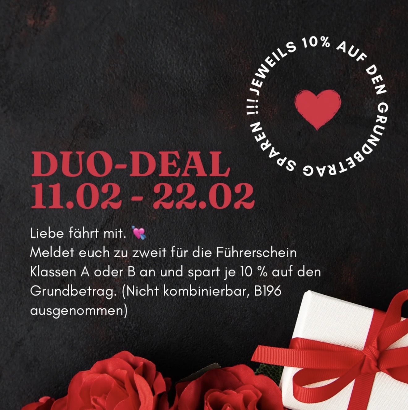 Erhaltet jetzt 10% Rabatt auf den Grundbetrag für beide, wenn ihr euch zu zweit gemeinsam für den Führerschein im A oder B Bereich bei uns anmeldet.* Das Angebot läuft bis zum 14.02.2025.